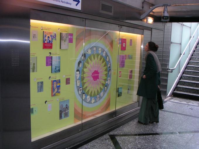 Vitrine de présentation des éditions Ego comme X dans le métro Bercy à Paris en 2005, contemplée par Sylvie Chabroux.