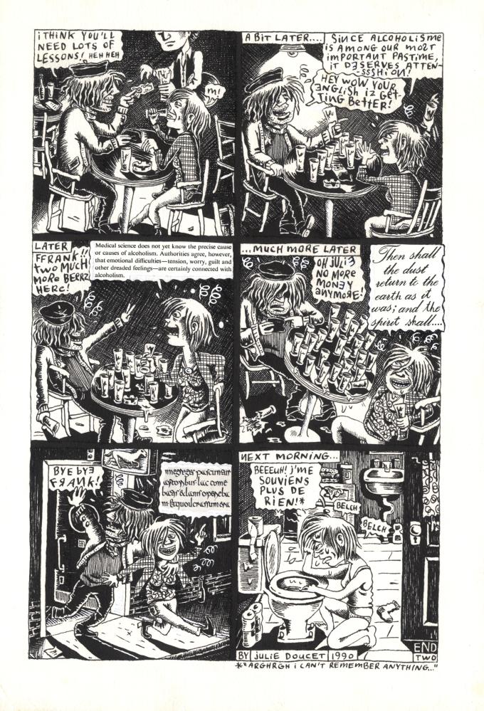Ce gag en deux pages met en scène Julie – le double de l’autrice – et Dré, un de ses amis anglophone. Au départ de l’histoire Julie demande à Dré, présenté comme possédant un très bon niveau en anglais, de l’aider à améliorer le sien. Cet enseignement lui sera rémunéré par des bières que Julie s’engage à lui offrir. La leçon d’anglais se tient donc dans un bar, topos récurrent chez Julie Doucet. Elle se déroule en l’espace de sept cases de mêmes dimensions et au cadrage quasi identique. L’angle de vue change légèrement d’une case l’autre suggérant un dérèglement dans la scène, une perte de contrôle des protagonistes sur eux-mêmes, à mesure que le temps s’écoule. Le cadre est serré sur les deux personnages qui, attablés au premier plan, devisent en éclusant des bières. Le second plan très écrasé, en raison d’une profondeur de champ à peine esquissée, atténué par le hachurage assez dense, suggère la présence d’un troisième protagoniste, Franck le barman, hors-champ durant une grande partie de la séquence, qui est interpellé pour approvisionner la tablée en pintes de bière. La leçon dure longtemps, certainement une partie de la nuit. L’écoulement du temps est suggéré à la fois par la légère modification du cadrage qui fait apparaître des changements d’ombres d’une case à l’autre ; par de courtes indications contenues dans les cartouches (« A bit later », « Later », « … much more later » et enfin par la multiplication des verres de bières vides sur la table soulignant de nombreuses tournées successives. La vis comica de cette séquence repose sur un procédé bien connu de répétition, ici avec des modifications visuelles qui suggèrent l’état d’ébriété dans lequel s’installent nos deux protagonistes. La 5e case offre un de ces changements de cadrage. Le point de vue légèrement déplacé nous présente les protagonistes en légère plongée. Cet angle qui a pour effet de diminuer les perspectives donne l’impression que les deux amis se tassent sous l’effet de l’ivresse qui les gagne. Ce changement d’angle entre la 4e et la 5e case induit un effet de mouvement autour du couple. Un léger roulis qui devient même tangage dans l’antépénultième case de l’histoire dans laquelle la table, dont le plateau circulaire parait creusé de sillons pareils à ceux d’un disque sur une platine, semble sur le point de se renverser sous le nombre (et le poids) des verres qui l’ont envahie.