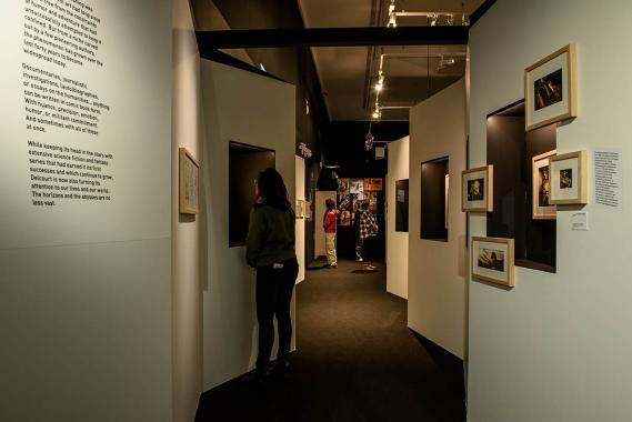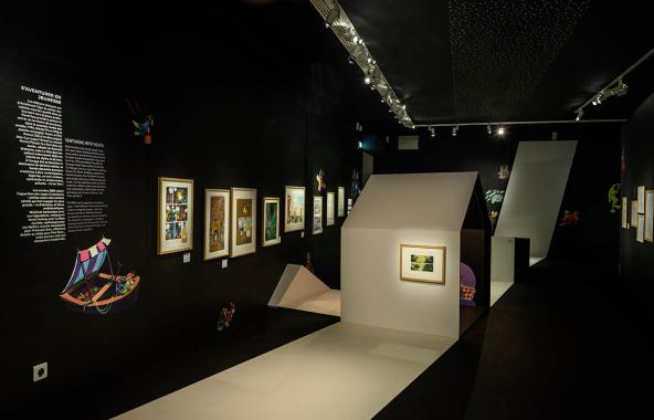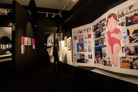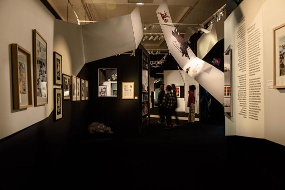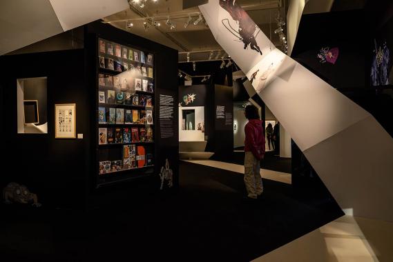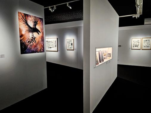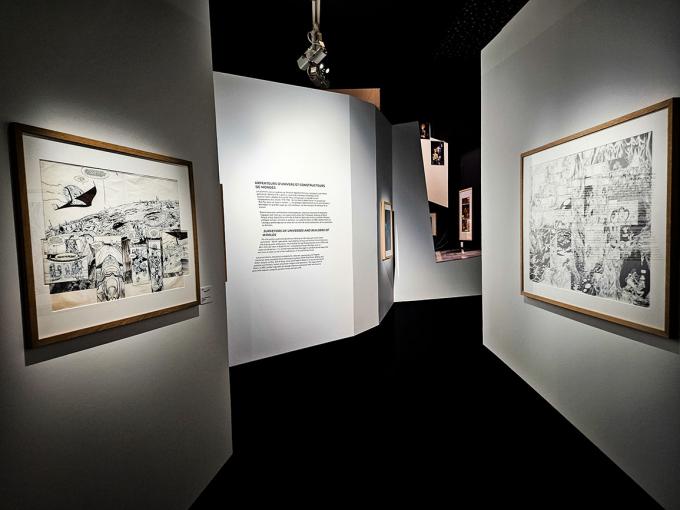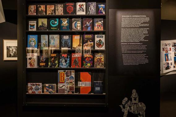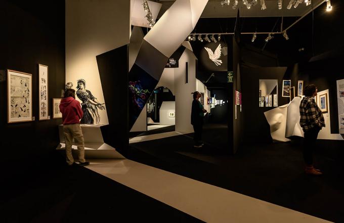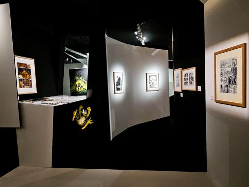 Pour raconter cette histoire riche et protéiforme, le studio Lucie Lom, sous la houlette d'Élisa Fache et de Marc-Antoine Mathieu, l’un des auteurs phares de Delcourt, a choisi de déplier une bande, comme un immense origami blanc sur fond noir. La déplier ne signifie pas la mettre à plat. Au contraire : il s’agit de laisser apparents les angles, les recoins, les miroirs ; de se servir ici ou là d’une transparence, d’une perspective, d’un froissement, d’une déchirure… afin de révéler des jeux d’influences, d’échos, de correspondances, mais aussi afin de surprendre, étonner, amuser. À la fois sobre et monumentale, élégante et ludique, la scénographie du parcours, au service des planches exposées, est une œuvre en soi.