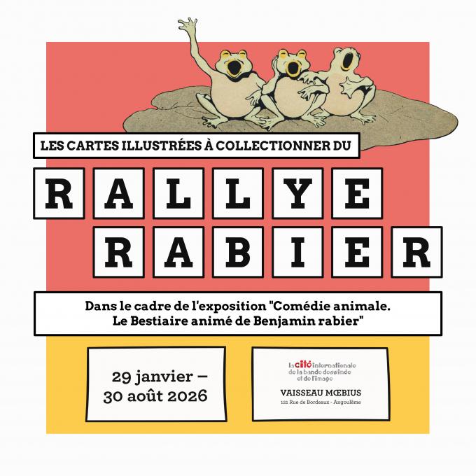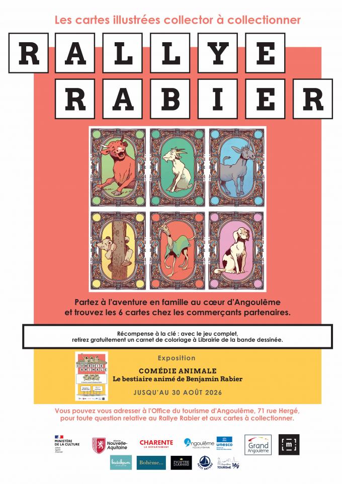 À la poursuite du bestiaire de Rabier : un rallye inédit au cœur d’Angoulême. Une chasse aux cartes ludique autour de l’exposition « Comédie animale » Partez à l’aventure en famille au cœur d’Angoulême : 6 cartes à collectionner, issues de l’univers de Benjamin Rabier.
