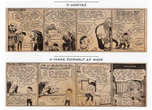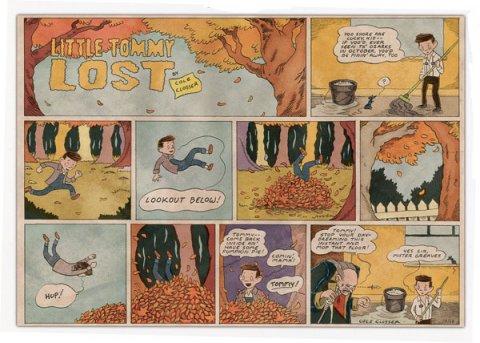 À cette liste non limitative il faut maintenant ajouter le nom de Cole Closser, qui a publié fin 2013, chez Koyama Press, à Toronto, un album de 72 pages à l’italienne intitulé Little Tommy Lost : Book No.1. La maquette extérieure renvoie à celles des premiers albums de l’histoire de l’édition de bande dessinée américaine, le titre, le sujet et le graphisme faisant plus particulièrement signe vers la Little Orphan Annie d’Harold Gray.
