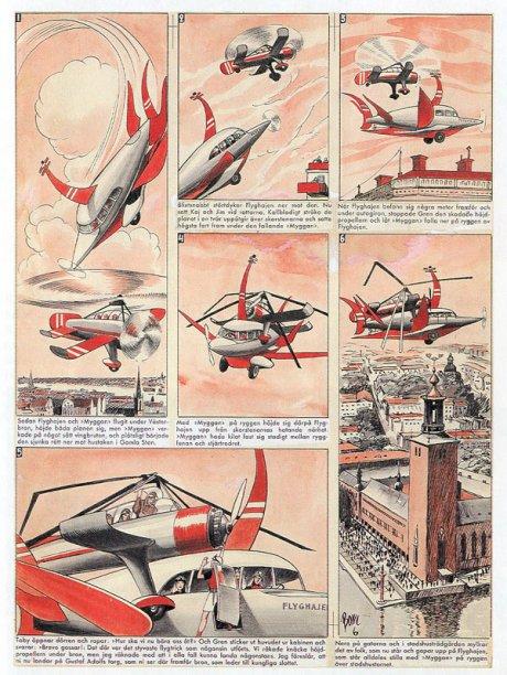 La planche la plus étonnante qu’il m’ait été donné de voir de la main de Bovil (c’est l’une des deux pages reproduites dans l’Histoire de la bande dessinée suédoise, des origines à nos jours, mais on peut trouver un plus long extrait de cette histoire – 7 planches – dans le livre que Björn Vilson a consacré à son père, Boken om Bovil. En serietecknande konstnär, Carlsen Comics, Stockholm, 1992) est extraite d’un récit de 1947 intitulé Ask och Embla (« Ask et Embla »), inspiré des mythes scandinaves. Bovil avait interrompu sa production habituelle pendant six mois (il fournissait habituellement deux pages par semaines) pour se consacrer à ce projet personnel, une bande dessinée que Fredrik Strömberg et Björn Vilson qualifient tous deux d’« expérimentale ». Mais son éditeur rebuta le projet, sans doute trop en avance pour l’époque, et il resta malheureusement dans les cartons de l’artiste.