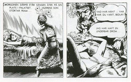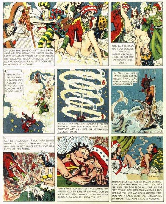 On ne peut qu’être frappé par la place faite à l’érotisme dans plusieurs de ses créations (notamment son Sindbad et son Aladin). Cela ne semble pas avoir posé problème au magazine hebdomadaire qui publia ces histoires, en l’occurrence Vecko-Revyn, une publication destinée à un public familial. Strömberg me confirme que les jeunes garçons qui ont découvert ces pages à l’époque en ont conservé un souvenir ému.