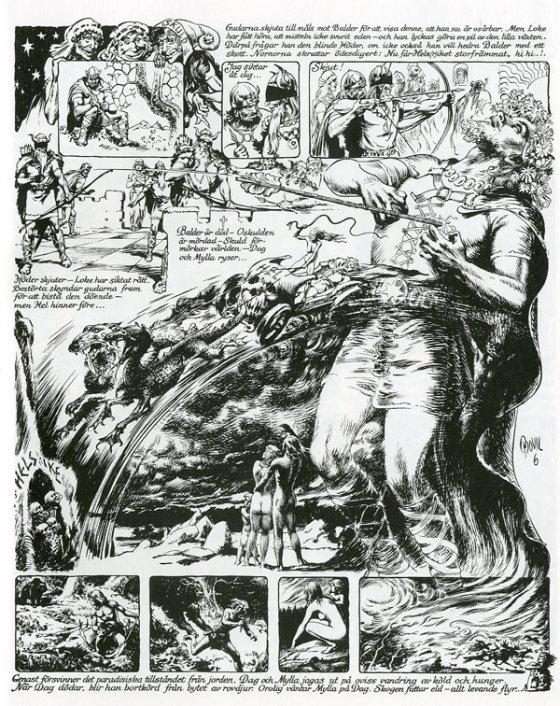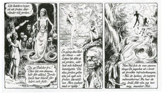 La mise en page y est beaucoup plus libre que dans ses autres productions. Trois personnages de femmes âgées (des sorcières ?) paraissent endosser la fonction de narratrices. Le trait est particulièrement fougueux et vivant, avec une utilisation très efficace de la hachure, un lettrage élégant, et une imagerie d’une grande richesse : en l’espace de quelques pages, sans rien comprendre à l’histoire, je vois défiler des visions de la Préhistoire, des vikings, des Dieux (notamment Balder, représenté ici en géant ; censément immortel, il tombe néanmoins sous une flèche décochée par Loke), des personnages évoluant nus comme dans quelque jardin d’Eden (ce sont Ach et Embla, les équivalents d’Adam et Eve dans la mythologie nordique), une vieille femme décharnée à tête de mort entourée de serpents et de squelettes…