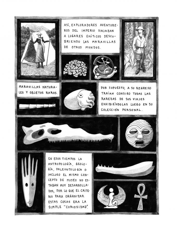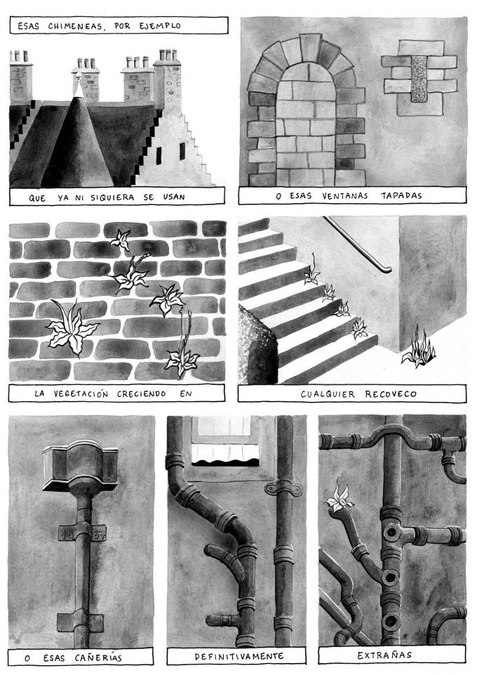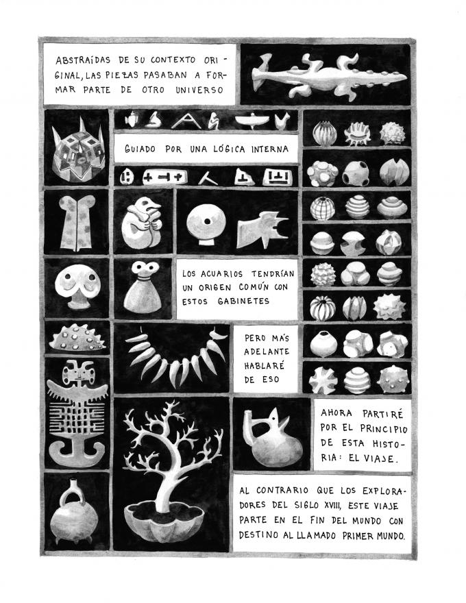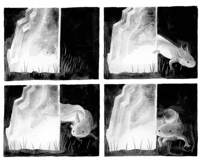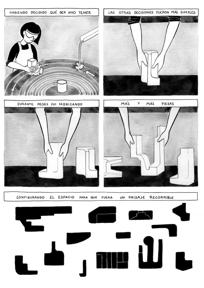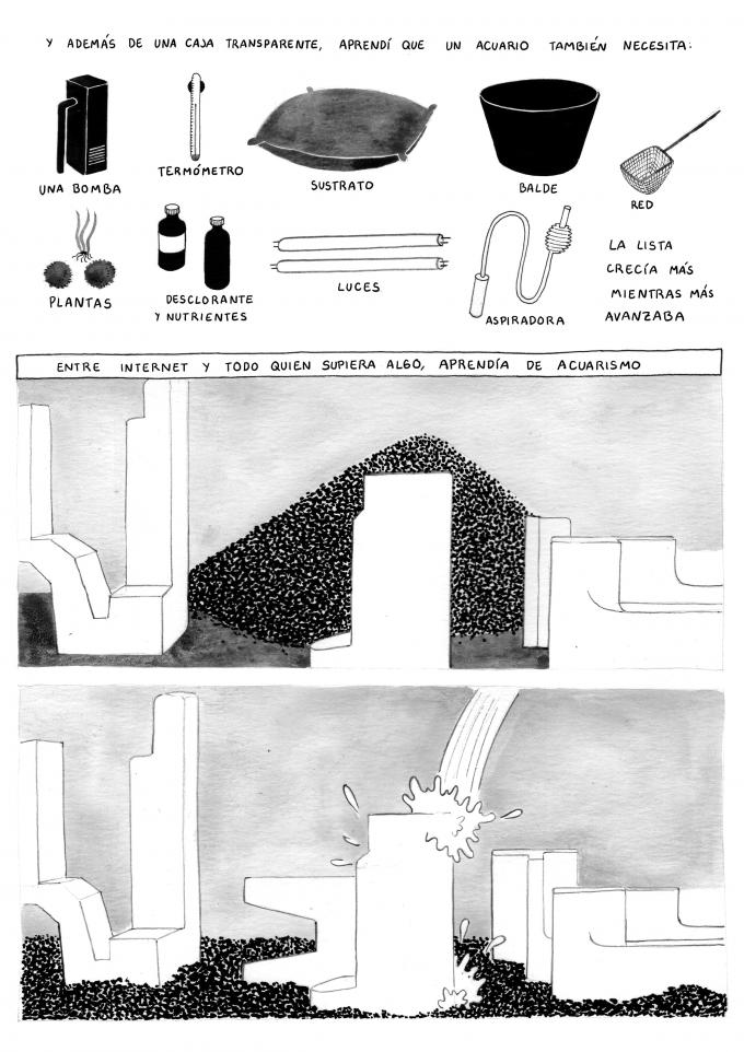 C’est une bonne remarque. Je n’y avais pas vraiment pensé mais c’est vrai que je m’intéresse beaucoup aux processus. Dans Al otro lado del vidrio, qui est autobiographique, il s’agit de raconter un processus que j’avais traversé personnellement et c’était facile d’en décrire les étapes. Lorsque j’étais à Édimbourg, j’ai appris à construire un aquarium et à l’entretenir pour y faire vivre un axolotl pour mon projet de fin d’études. Au départ, tout ce processus avait uniquement servi à réaliser l’œuvre finale. Mais c’est ce qui a fait le corps-même du livre qui raconte ce travail. C’est justement un des plaisirs de la narration visuelle, de pouvoir donner de l’espace au processus. Il n’y a pas que l’image finale qui compte mais comment on y arrive.
