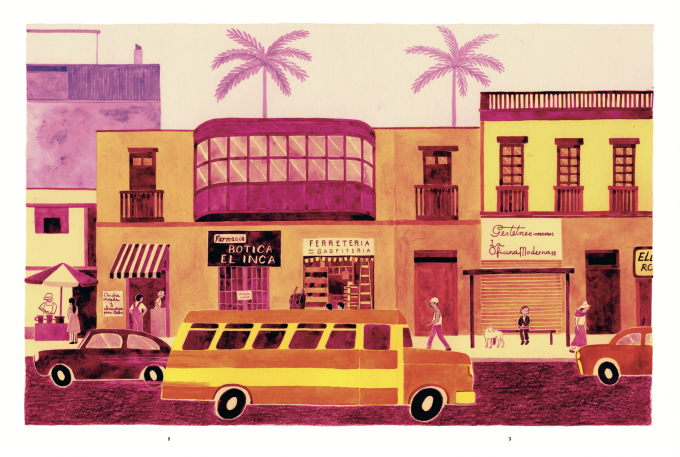 Dans ce cas, le travail de recherche en amont est différent car c’est son expérience personnelle à lui et ce n’est pas moi qui écris l’histoire. Ma recherche a consisté à comprendre comment on vit ce genre d’expérience afin de pouvoir la représenter. J’ai fait beaucoup de recherches sur Lima, au Pérou, où se déroule en grande partie le récit. Je connais un peu cette ville car j’y ai passé une dizaine de jours, mais ce n’est pas beaucoup. En plus, l’action a lieu pendant les années 1960. Alors j’ai passé beaucoup de temps à chercher des images de la ville, à construire et à réfléchir à la façon de représenter la maison familiale, parce qu’il fallait presque la réinventer pour qu’il y ait une certaine cohérence dans le livre.