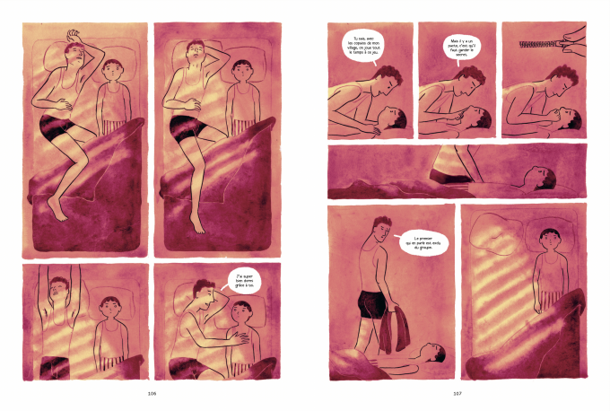 En effet, je me suis souvent demandé, au fil de la création du livre, comment représenter le traumatisme et la violence sans que cela ne suscite une curiosité malsaine ou une forme de plaisir. C’est très délicat de se tenir sur le fil entre, d’un côté, la nécessité de montrer la réalité d’un viol sur mineurs dans ce que cela a de plus dur et, de l’autre, ne pas tomber dans le travers de produire une image ou une séquence tellement explicite qu’elle pourrait devenir pornographique. Je ne pense pas qu’il y ait une règle qui puisse être appliquée à toutes les œuvres. En tout cas, pour ce livre, même si le point de vue est celui du garçon et qu’il y a beaucoup de tendresse et de naïveté dans son regard, notre objectif était de ne pas atténuer la violence de l’abus qu’il subit et qui est subtilement annoncé pendant toute la première moitié du récit, bien qu’il soit au final assez court. Sans entrer dans les détails de la scène, j’ai dû la dessiner plusieurs fois pour trouver l’équilibre précis entre ce que l’on montre, les moments précis de la séquence, et ce que l’on ne montre pas. En y repensant, je crois que ces moments crus permettent de réaliser à quel point ce vécu et ses conséquences ont pesé lourd sur la victime.