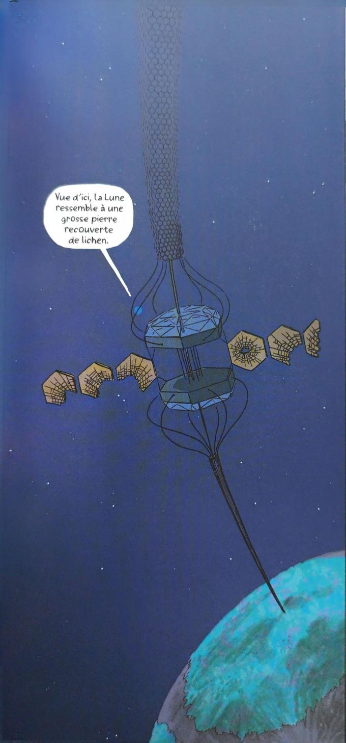La critique des inégalités sociales et environnementales est subordonnée à une critique du long-termisme. Cette idéologie tout droit venue de la Silicon Valley sert de « toile de fond » au New Space selon le journaliste Julien Le Bot (2024, 169). La vision long-termiste suppose que ce qui doit être prioritaire aujourd’hui est la préservation de l’avenir, quoi qu’il en coûte dans le présent. Appliquée (théoriquement) à l’espace, elle permet de justifier les conséquences sociales et écologiques de la mise en place d’un plan de colonisation spatiale qui, dans le futur, assurerait la pérennité de l’humanité. Il en va ainsi dans l’intrigue de Kosmograd,où la construction d’un ascenseur spatial permettant à quelques happy fews de survivre à la catastrophe climatique à venir, et, par conséquent, de faire perdurer le genre humain, justifie l’exploitation et le sacrifice d’une ville entière. Le premier tome d’Avaler la Lune de Lucie Castel, Robin Cousin et Grégory Jarry reprend aussi le motif de l’ascenseur spatial – analogie à peine voilée de la théorie de l’ascenseur social et de ses dysfonctions. Un petit groupe de scientifiques et d’ingénieurs réfléchissent à un moyen de « sauver l’humanité » (Castel, Cousin, Jarry 2025, 55) condamnée à disparaître d’ici trente ans à cause de la pollution et du manque d’énergie. Pour ce faire, ils installent un ascenseur spatial qui relie la Terre à la Lune. Cette dernière est le seul endroit assez vaste et non pollué pouvant accueillir des forêts sous serres générant de l’électricité grâce à des « piles à végétaux » (Castel, Cousin, Jarry 2025, 55-58). La finalité de ce projet est d’alimenter des « dépollueurs » avec cette électricité verte et d’inverser ainsi le cours de la catastrophe climatique. Or, sa réalisation risque elle-même de précipiter la disparition de l’humanité. Le projet est lancé malgré les risques, avec en ligne de mire la survie à long terme du genre humain. Dans Avaler la lune, les projets spatiaux salutaires sont donc représentés comme des paris sur l’avenir affranchis de garde-fous éthiques (ill. 4).