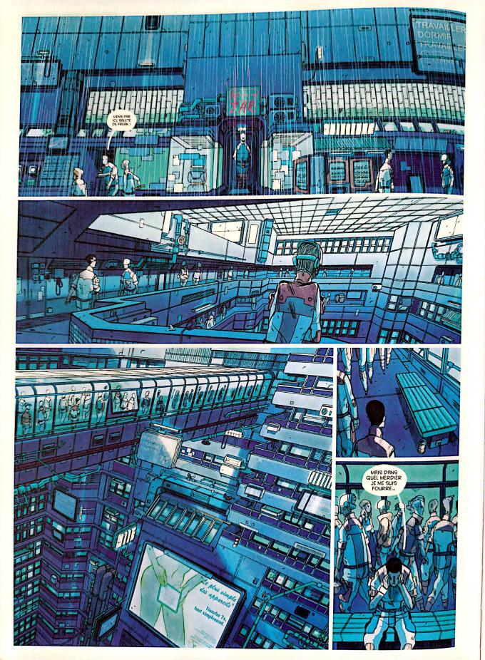 Les BD du corpus partagent néanmoins quelques motifs visuels récurrents, mais non systématiques, qui assurent la filiation de ces BD à la SF spatiale et à la SF cyberpunk. On y trouve d’abord des paysages spatiaux, composés traditionnellement d’un fond noir, de planètes et de lunes, d’étoiles et d’artefacts humains (vaisseaux, satellites, stations). Le jeu d’échelle permanent entre ces éléments est constitutif de l’horizon d’attente visuel de la BD de SF spatiale. On y trouve ensuite un urbanisme débridé exprimé à travers les images de villes étouffantes, soit à l’intérieur des habitats spatiaux, soit sur le sol d’autres planètes. Ces villes signifient les difficultés à vivre dans l’espace ou sur la Terre. Les espaces de vie sont, par exemple, réduits chez Bablet et Singelin (ill. 6.1 et 6.2), mais ce sont aussi des lieux hypertechnicisés, comme en témoigne la profusion de câbles dans les cases dont le décor est l’intérieur des stations. Bonaventure présente pour sa part la ville dystopique de Kosmograd sur Terre, juste avant une catastrophe climatique et le départ des riches de la ville à bord d’une arche spatiale (ill. 6.3). Chez ces trois auteurs, les espaces urbains occupent l’ensemble des cases la plupart du temps : la ville oppresse parce qu’elle ne laisse voir aucun horizon. Ces représentations rappellent les décors urbains de Mœbius dans The Long Tomorrow écrit par Dan O’Bannon (1976), qui a inspiré, entre autres, Ridley Scott pour Blade Runner (1982).