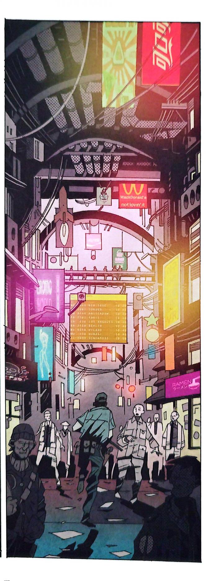 Ces tableaux désenchantés du futur sont complétés par une profusion de publicités et de néons qui achèvent la filiation de ces BD avec le sous-genre du cyberpunk. Les néons signalent une absence de lumière naturelle ; ce sont des marqueurs de l’artificialité des lieux habités dans ces fictions (ill. 8.1). La publicité à outrance, pour sa part, suggère que l’astrocapitalisme n’est pas un simple mode de financement des projets spatiaux, mais la tentative de poursuivre la société de consommation (Baudrillard 1991 [1970]) au-delà des limites terrestres (ill. 8.2).