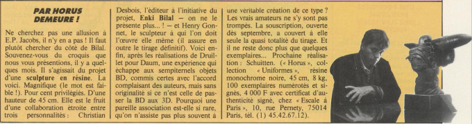 « Échappe[r] aux sempiternels objets BD », la sculpture Horus d’Enki Bilal. Pilote & Charlie, n° 11, février 1987, p. 7