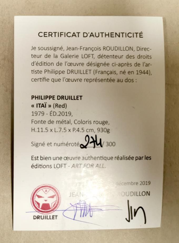 Or, dès cette époque, Druillet s’ouvre à d’autres formes créatives que l’illustration et la bande dessinée, revendiquant une diversité d’expressions médiatiques qu’il inscrit au sein d’une démarche artistique et d’un imaginaire personnel unifiés. En témoigne la sculpture Itaï, dont la toute première version, en 1979, correspond à un bronze numéroté et signé, réalisé en 150 exemplaires par le fondeur Figini à la taille 10 x 6 cm, et qui est suivie de multiples rééditions dans les années 1980 et jusqu’à aujourd’hui. L’Itaï conservé dans les réserves de la Cité internationale propose ainsi une version récente et réactualisée : la figurine en fonte de métal et peinture epoxy rouge (il en existe aussi une version or), réalisée au format 11,5 x 7,5 cm et portant le numéro 274/300, est commercialisée en 2019 par la Galerie Loft dans sa collection « Art for all » et vendue dans un coffret avec certificat d’authenticité.