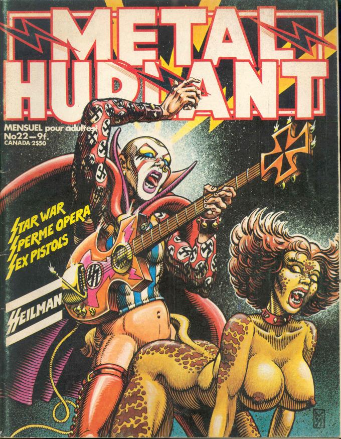 De fait, si la bande dessinée et la science-fiction donnent son identité graphique et éditoriale au magazine (nourrissant, dans les premières années, le gros des chroniques et des publicités), elles s’associent à un troisième pôle, appelé à devenir capital : le rock, comme sous-culture globale (touchant autant à la musique qu’à l’apparence vestimentaire, au langage, aux modes de vie mis en scène et aux esthétiques mobilisées). Bénéficiant de l’expertise enthousiaste de Manœuvre, l’esthétique rock dépasse le périmètre des pages de critique musicale pour contaminer tous les espaces du périodique : couvertures provocatrices, intrigue des bandes dessinées (Frank Margerin, avec le personnage de Lucien, Dodo et Ben Radis et les déboires des « Closh », Tramber et Jano, avec le rat Kebra, qui connaîtra aussi des aventures science-fictionnelles) et goût pour des pratiques underground qui s’apparentent de plus en plus à une culture branchée. Imaginaire rock, science-fiction adulte, bande dessinée marquée par l’underground, provocation et pornographie (à une époque où celle-ci s’associe encore volontiers à un discours radical) créent une cohérence discursive du magazine au croisement de la contre-culture et de ce qu’on n’appelle pas encore la pop culture, mais dont Métal hurlant contribue à définir le périmètre. C’est une telle synthèse qu’offre par exemple la couverture du numéro 22, signée Voss, en présentant un rocker, guitare à la main et costume glam illustré de symboles nazis, sodomisant une extraterrestre.